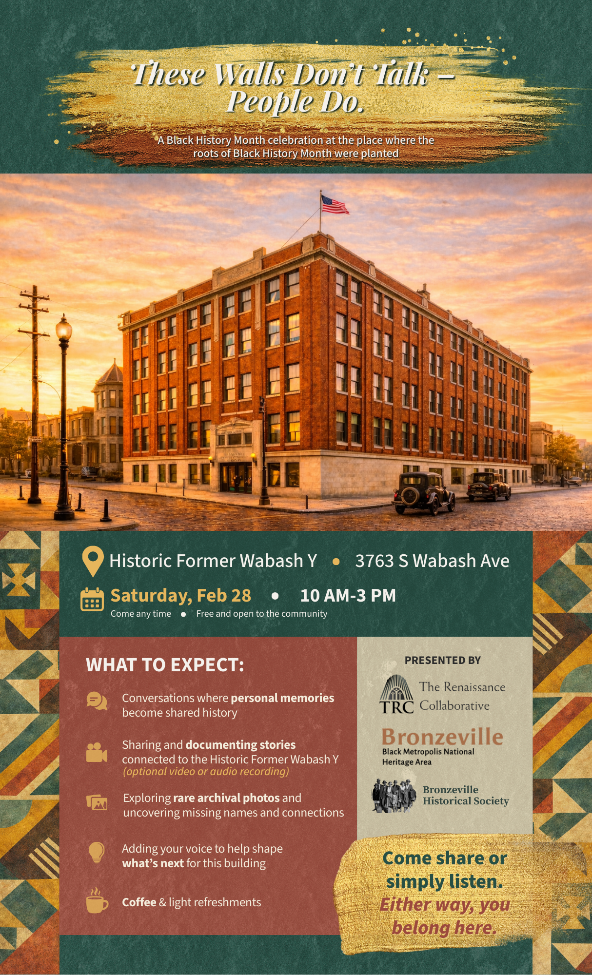 Held in recognition of the 100th anniversary of Negro History Week - conceived by Carter G. Woodson and his peers at the Wabash Y - the event invites neighbors, families, and visitors to reflect, listen, and contribute their voices to a living history of the building and the community it has served.
